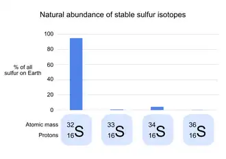 | Enxofre | 32S | 94,99% | 34S | 4,25% | CDT (Cañon Diablo Troilite) |