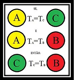 Imagem representando a Lei zero da termodinâmica. Se dois corpos estão em equilíbrio térmico com um terceiro, então eles estão em equilíbrio térmico entre si.