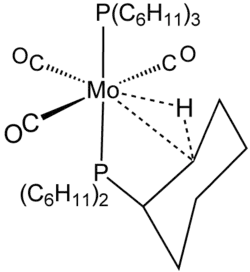 A estrutura do complexo tricarbonilbis(triciclohexilfosfina)molibdênio, que contém uma ligação 3c-2e C-H-Mo, a qual é representada neste exemplo como linhas tracejadas em uma forma triangular (esta estrutura também é um exemplo de interação agóstica).