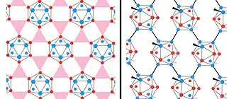 entre si são de dois tipos: ligações tricentradas (formas triangulares rosadas) entre três boros de três gaiolas diferentes em uma mesma camada, realizadas a partir dos átomos “equatoriais” de cada gaiola icosaédrica (representados como esferas vermelhas); e ligações covalentes convencionais entre os átomos dos “polos” (representados como esferas azuis) de uma gaiola icosaédrica de uma camada com os átomos dos “polos” das unidades de outra camada acima ou abaixo. Cada "polo" correspondente a uma face triangular oposta do icosaedro. À esquerda, representação das ligações dentro de uma mesma camada (tricentradas), e à direita, representação das ligações entre unidades de camadas diferentes (normais).