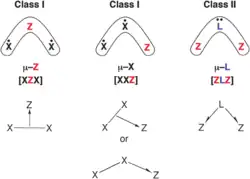 • As ligações 3c-2e de classe II constituem os casos em que um dos átomos envolvidos contribui com os dois elétrons da ligação, enquanto os dois outros contribuem com orbitais vazios. Exemplos incluem ligantes como carbonila e fosfina em ponte entre dois íons metálicos em alguns complexos de metais de transição.[8]