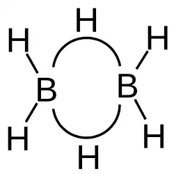 Estrutura do Tetraborano. As ligações 3c-2e, como vistas neste exemplo, são frequentemente representadas como dois traços separados, dando a falsa impressão de serem duas ligações covalentes simples, criando a ideia equivocada de que o átomo de hidrogênio está formando duas ligações covalentes, o que é impossível. Os traçados B-H-B mostrados aqui são, na realidade, uma única ligação unindo os três átomos.