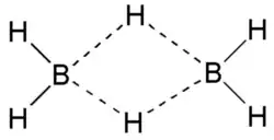 Ligações tricentradas no diborano representada como linhas tracejadas.