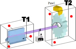 Imaginemos um sistema muito pequeno (ver abaixo) de duas pás ou engrenagens ligadas por um eixo rígido e que é possível manter estas duas pás a duas temperaturas diferentes. Uma das engrenagens (em T2) tem uma lingueta que está retificando o movimento do sistema, e, portanto, o eixo só pode se mover em uma rotação no sentido horário, e ao fazê-lo, poderia levantar um peso (m) para cima em cima de catraca. Agora imagine se o remo na caixa T1 estava em um ambiente muito mais quente do que a engrenagem na caixa T2; seria de esperar que a energia cinética das moléculas de gás (círculos vermelhos) que atingem a pá em T1 seria muito mais elevada do que as moléculas de gás que atingem a engrenagem em T2. Por conseguinte, com menor energia cinética dos gases no T2, haveria pouca resistência das moléculas ao colidirem com a engrenagem na direcção oposta estatisticamente. Além disso, o roquete iria permitir a direcionalidade, e lentamente ao longo do tempo, o eixo de roquete iria rodar e, levantando o peso (m).