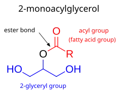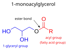Monoglicerídeos (também: acilgliceróis ou monoacilgliceróis) são uma classe de glicerídeos compostos por uma molécula de glicerol ligada a um ácido graxo por meio de uma ligação éster.[1] Como o glicerol contém grupos de álcool primário e secundário, podem ser formados dois tipos diferentes de monoglicerídeos: 1-monoacilgliceróis, em que o ácido graxo está ligado a um álcool primário, ou 2-monoacilgliceróis, em que o ácido graxo está ligado ao álcool secundário.