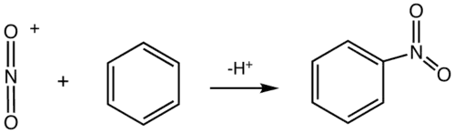 Como exemplo típico e mais simples, temos a nitração do benzeno, na produção do nitrobenzeno. O método clássico envolve o tratamento de benzeno com uma mistura de ácido sulfúrico e ácido nítrico concentrados (chamada de "mistura sulfonítrica") e água. Esta produção é um dos mais perigosos processos da indústria química devido à exotermicidade da reação (ΔH = −117 kJ/mol).[1]