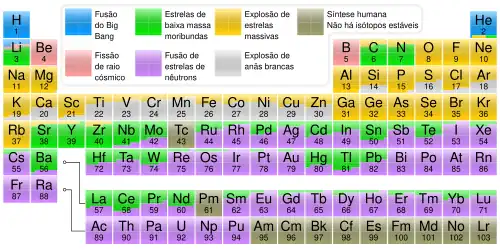 A nucleossíntese é o processo de criação de novos núcleos atômicos a partir dos núcleos preexistentes (prótons e nêutrons) para chegar a gerar o restante dos elementos da tabela periódica. Os núcleos primogênitos preexistentes se formaram a partir do plasma de quarks-glúons do Big Bang quando o universo se esfriou abaixo dos dez milhões de graus, este processo se pode chamar nucleogênese, a geração de núcleos no Universo. A consequente nucleossíntese dos elementos (incluindo todo o carbono, todo o oxigênio, etc.) ocorre principalmente no interior das estrelas por fusão ou fissão nuclear.