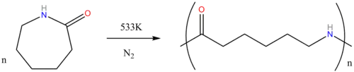 Quando a caprolactama é aquecida a 533 K (250 C) em uma atmosfera inerte de nitrogênio por cerca de 4-5 horas, o anel abre e polimeriza. A formação de fibras é resultado da passagem da massa derretida é passada através de fieiras para formar fibras de nylon 6.