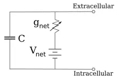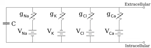 Os eletrofisiologistas modelam os efeitos das diferenças de concentração iônica, canais iônicos e capacitância da membrana em termos de um circuito equivalente, que se destina a representar as propriedades elétricas de um pequeno pedaço de membrana. O circuito equivalente consiste em um capacitor em paralelo com quatro caminhos cada um consistindo de uma bateria em série com uma condutância variável. A capacitância é determinada pelas propriedades da bicamada lipídica e é considerada fixa. Cada uma das quatro vias paralelas vem de um dos principais íons, sódio, potássio, cloreto e cálcio. A voltagem de cada via iônica é determinada pelas concentrações do íon em cada lado da membrana. A condutância de cada via iônica em qualquer ponto no tempo é determinada pelos estados de todos os canais iônicos que são potencialmente permeáveis a esse íon, incluindo canais de vazamento, canais dependentes de ligantes e canais iônicos dependentes de voltagem.
