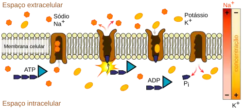 As bombas iônicas são proteínas integrais de membrana que realizam transporte ativo, ou seja, usam energia celular (ATP) para "bombear" os íons contra seu gradiente de concentração.[6] Essas bombas iônicas captam íons de um lado da membrana (diminuindo sua concentração ali) e os liberam do outro lado (aumentando sua concentração ali).