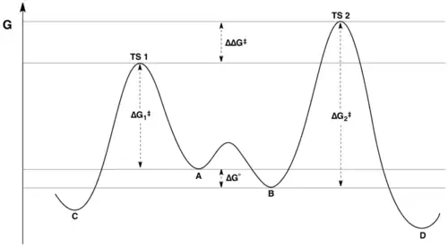 A proporção de produtos depende apenas do valor marcado como ΔΔG ‡ na figura: C será o principal produto, porque a energia de TS1 é menor que a energia de TS2. Uma afirmação comum, mas falsa, é que a distribuição do produto não reflete de forma alguma as energias livres relativas dos substratos A e B; de fato, reflete as energias livres relativas dos substratos e as energias de ativação relativa. Esse mal-entendido pode resultar da falta de apreciação da distinção entre "a diferença de energias de ativação" e "a diferença de energias no estado de transição". Embora essas quantidades possam inicialmente parecer sinônimas, a última leva em consideração a constante de equilíbrio para a interconversão de A e B, enquanto a primeira não.