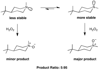 Um exemplo de cenário de Curtin-Hammett, no qual o isômero conformacional mais estável reage mais rapidamente, é observado durante a oxidação das piperidinas. No caso da N-metil piperidina, a inversão do nitrogênio entre as conformações diastereoméricas é muito mais rápida que a velocidade da oxidação da amina.[8] A conformação que coloca o grupo metil na posição equatorial é 3,16 kcal / mol mais estável que a conformação axial.[9] A proporção do produto de 95: 5 indica que a conformação mais estável leva ao produto principal.[10]