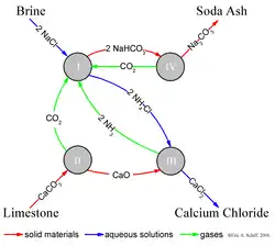 O Processo Solvay utiliza como insumos salmoura e dióxido de carbono (CO2). Também há a utilização de amônia, mas esta é reciclada durante o processo.
