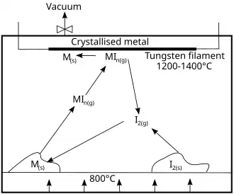 Titânio (Ti), zircônio (Zr), háfnio (Hf), vanádio (V), tório (Th) ou protactínio (Pa) impuros são aquecidos com I2, num reator sob vácuo, formando o iodeto (por exemplo, tetraiodeto de titânio (TiI4) ou de zircônio (ZrI4)). Estes são voláteis e se separam das impurezas. À pressão atmosférica, o TiI4 funde a 150 °C e entra em ebulição a 377 °C; o ZrI4 funde a 499 °C e entra em ebulição a 600 °C. À pressão reduzida, contudo, os pontos de ebulição são mais baixos. O MI4 (onde M é o metal em questão) gasoso é, então, decomposto sobre um filamento de tungstênio aquecido à incandescência. Porém, à medida que mais e mais metal vai se depositando sobre o filamento, este reduz a capacidade de conduzir a eletricidade. Assim, é necessário aumentar a intensidade da corrente, para manter o filamento incandescente.