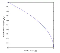 À direita, a razão acima dos raios de Bohr relativísticos e não relativísticos foi plotada como uma função da velocidade do elétron. Observe como o modelo relativístico mostra que o raio diminui com o aumento da velocidade.