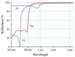 A refletividade de alumínio (Al), prata (Ag) e ouro (Au) é mostrado no gráfico à direita. O olho humano vê radiação eletromagnética com um comprimento de onda próximo de 600 nm como amarelo. O ouro absorve luz azul mais do que absorve outros comprimentos de onda visíveis de luz; a luz refletida que chega ao olho é, portanto, carente de azul em comparação com a luz incidente. Como o amarelo é complementar ao azul, isso faz com que um pedaço de ouro sob luz branca pareça amarelo aos olhos humanos.