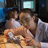 Químico é um profissional treinado no estudo das diversas ciências químicas.[1] Os químicos estudam a composição, e as transformações da matéria e suas propriedades, tais como a densidade e acidez. Descrevem cuidadosamente as propriedades por eles estudadas em termos de quantidade, com detalhes sobre o nível de moléculas e átomos que os compõem. Medem proporções de substâncias, as taxas de reação e demais propriedades químicas.[2]