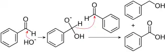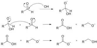 O mecanismo mais aceito inicia pela adição de hidróxido sobre o aldeído resultando em um alcoxi-diol vicinal. Este intermediário transfere hidreto para outra molécula de aldeído e resulta no ácido carboxílico. A molécula de álcool que recebe o hidreto forma o alcóxido correspondente, que resulta no álcool após capturar um próton do solvente.