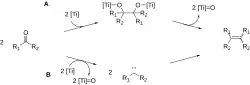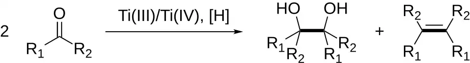- ↑ Mukaiyama, T.; Sato, T.; Hanna, "Reductive Coupling of Carbonyl Compounds to Pinacols and Olefins by Using TiCl4 and Zn" Chem. Lett. 1973, 1041. doi:10.1246/cl.1973.1041