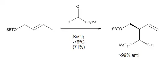 Como mostrado na Figura 13, Corey e colaboradores[14] propuseram um estado de transição inicial para esta reação, com o objetivo de explicar a alta enantiosseletividade observada (assumindo que a reação é exotérmica como calculada a partir de energias de ligação padrão). Mesmo que a estrutura do catalisador ativo não seja conhecida, o modelo de Corey propõe o seguinte: o aldeído é ativado pela complexação com o catalisador quiral (R)-BINOL-TiX2 via o par de elétrons solitários de formilo sin para o hidrogênio do formilo para formar uma estrutura de Ti pentacoordenada. Ligação de hidrogênio CH—O ocorre ao mais favorável estereoeletronicamente par solitário do oxigênio do ligando BINOL. Em tal estrutura, a face de topo (re) do grupo formilo é muito mais acessível a um ataque de nucleófilo, como a face inferior (si) está protegido pelos vizinha porção molecular naftol, dando assim a configuração observada do produto.
