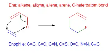 Esta transformação é uma reação pericíclica de transferência de grupo,[2] e portanto, usualmente requer substratos altamente ativados e/ou temperaturas altas.[3] No entanto, a reação é compatível com uma grande variedade de grupos funcionais que podem ser anexado às porções moleculares eno e enófilo. Além disso, muitos reações eno catalisadas por Ácidos de Lewis úteis tem sido desenvolvidas as quais podem proporcionar altos rendimentos e seletividades a temperaturas significativamente mais baixas, tornando a reação eno uma ferramenta de formação C–C útil para a síntese de moléculas complexas e produtos naturais.