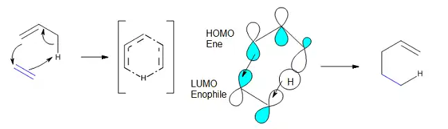 A principal interação fronteira-orbital que ocorre em uma reação eno é entre o HOMO do eno e o LUMO do enófilo (Figura 2).[5] O HOMO do eno resulta da combinação do orbital de ligação pi na porção molecular vinilo e o orbital da ligação C-H para o H alílico. As reações concertadas totalmente caracterizadas por carbono-eno, em geral, uma barreira de ativação alta, que foi aproximada em 33 kcal/mol no caso do propeno e eteno, conforme calculado teoricamente.[6] No entanto, se o enófilo torna-se mais polar (variando de etano a formaldeído), seu LUMO tem uma maior amplitude em C, rendendo uma melhor C–C se sobrepõem aquele pior das ligações H–O, determinando a reação a prosseguir de forma assíncrona. Isso se traduz em uma redução da barreira de ativação até 14.7 kcal/mol (M06-2X/def2-TZVPP), se S substitui O no enófilo. Por exame computacional tanto as barreiras de ativação como as tensões de ativação de diversas reações eno diferentes envolvendo propeno como o componente eno, Fernandez e colaboradores[6] encontraram que a barreira decresce nos enófilos na ordem: H2C=CH2 > H2C=NH > H2C=CH(COOCH3) > H2C=O > H2C=PH > H2C=S, ma medida que a reação torna-se mais e mais assíncrona e/ou a tensão de ativação decresce.