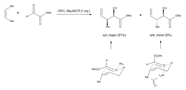 O estudo de ácidos de Lewis promovem reações carbonilo-eno, tais como processos eno catalisados por alumínio (Figura 4), levou os pesquisadores a considerar uma conformação do tipo cadeira para o estado de transição de reações eno que procedem relativamente tardios estados de transição.[2] A vantagem de tal modelo é o fato de que para parâmetros estéricos, tais como 1,3-diaxial e 1,2-diequatorial, as repulsões são fáceis de visualizar, o que permite previsões precisas quanto à diastereosseletividade de muitas reações.[2]