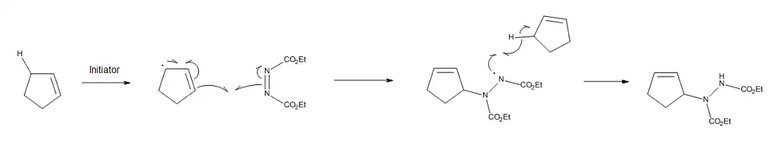 Quando um mecanismo concertado é geometricamente desfavorável, uma reação eno térmica pode ocorrer através de uma rota birradical passo a passo.[10] Outra possibilidade é um processo de radical livre, se iniciadores radicais estão presentes na mistura de reação. Por exemplo, a reação eno de ciclopenteno e cicloexeno com azodicarboxilato de dietilo pode ser catalisada por iniciadores livres de radicais. Como visto na Figura 5, a natureza passo a passo do processo é favorecida pela estabilidade dos radicais ciclopentenilo ou cicloexenilo, assim como a dificuldade de ciclopenteno e cicloexeno em adquirir a geometria ideal para um processo concertado.[11]