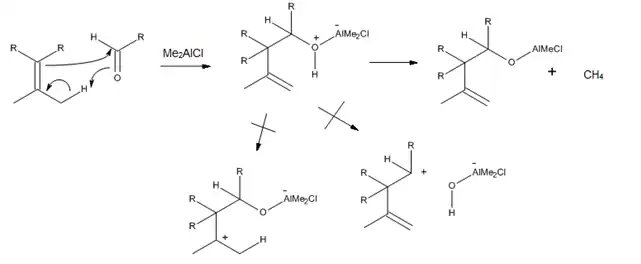 Dado que um ácido de Lewis pode formar complexo diretamente com um oxigênio carbonilo, vários catalisadores de trialquilalumínio foram desenvolvidos para enófilos que contêm uma ligação C=O. Em particular, foi descoberto que Me2AlCl é um catalisador muito útil para as reações eno de aldeídos e cetonas α,β-insaturados, assim como de outros aldeídos alifáticos e aromáticos. A razão por trás do sucesso desse catalisador é o fato que o complexo aduto eno- Me2AlCl pode posteriormente reagir para permitir metano e alcóxido de alumínio, os quais podem prevenir rearranjos catalisados por próton e solvólise (Figura 9).[3]