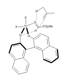 Uma direção atual no estudo de reações eno catalisadas por ácido de Lewis é o desenvolvimento de catalisadores assimétricos para formação de ligações C–C. Mikami[13] relatou o uso de um complexo de titânio quiral (Figura 12) em reações eno assimétricas envolvendo ésteres glioxilato proquirais.O catalisador é preparado in situ de (i-PrO)2TiX2 e binaftol oticamente puro, sendo a troca do ligando alcoxi facilitada pelo uso de peneiras moleculares. O método proporciona ésteres α-hidroxi de altas purezas enantioméricas, compostos que representam uma classe de importância biológica e sintética (Figura 12).[13]