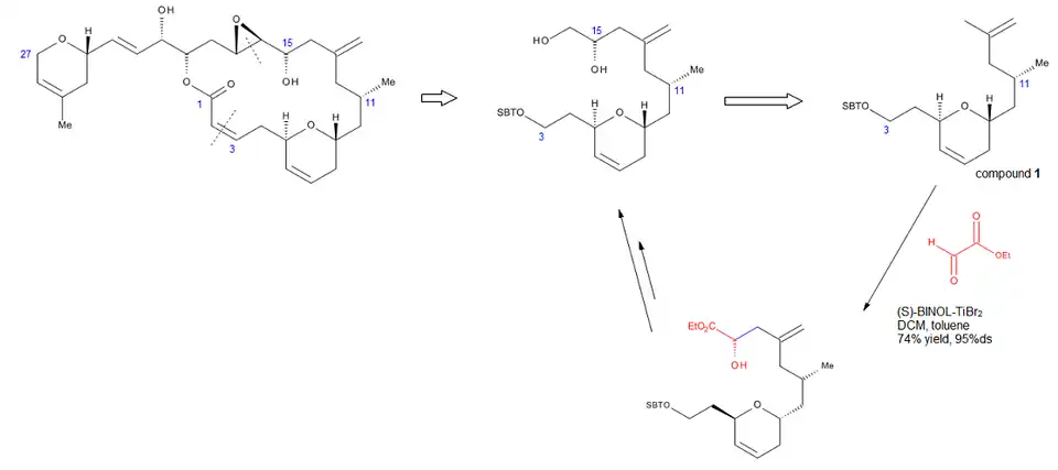 A síntese total formal de laulimalida [15] (Figura 14) ilustra a robustez da reação desenvolvida por Mikami. Laulimalida é um produto natural marinho, um metabólito de várias esponjas que pode encontrar um potencial uso como agente antitumoral, devido à sua capacidade de estabilizar microtúbulos. Um dos passos fundamentais da estratégia utilizada para a síntese do fragmento C3-C16 foi uma reação eno quiralmente catalisada que instalou o estereocentro C15. Tratamento do grupo alilo terminal do composto 1 com glioxilato de etila na presença de (S)-BINOL-TiBr2 catalítico forneceu o álcool requerido em rendimento de 74% e >95% e.d.. Este método eliminou a necessidade de um grupo de proteção ou qualquer outra funcionalidade no final da molécula. Em adição, realizando esta reação, Pitts et al. conseguiram evitar as condições rigorosas e baixos rendimentos associados com a instalação de unidades exo-metileno posteriormente na síntese.[15]