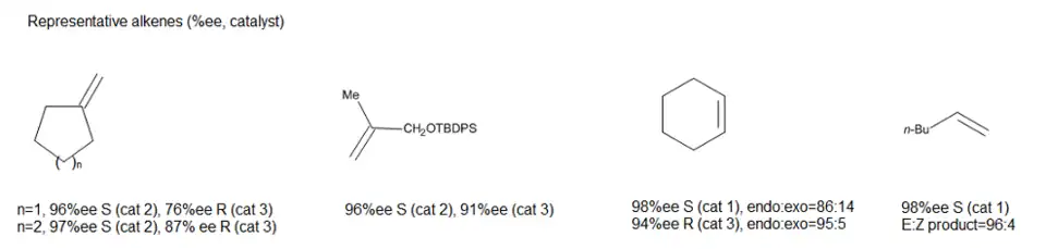 Evans e colaboradores[16] criaram um novo tipo de catalisadores C2-simétrico Cu(II) enantiosseletivos aos quais substratos podem quelar através de dois grupos carbonilo. Os catalisadores foram encontrados fornecendo altos níveis de indução assimétrica em vários processos, incluindo uma reação eno de glioxilato de etila com diferentes olefinas inativadas. Figura 15 apresenta os três catalisadores que eles encontraram como sendo os mais efetivos em fornecer ésteres alfa-hidroxi gama-delta-insaturados em altos rendimentos e enantiosseletividades excelentes. O que é especial sobre o composto 2 é que é estável e pode ser armazenado indefinidamente, tornando-se conveniente de ser usado. A reação tem um vasto escopo, como mostrado na Figura 16, devido a alta acidez de Lewis dos catalisadores, que pode ativar até mesmo olefinas nucleofílicas fracas, tais como 1-hexeno e cicloexeno.