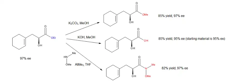 Inicialmente, o valor do método desenvolvido por Evans e colaboradores comprovaram convertendo com sucesso o éster alfa-hidroxi resultante no correspondente éster metílico, ácido livre, amida de Weinreb e éster alfa-azido, sem qualquer racemização, como mostrado em Figura 18.[16] Vale ressaltar que o deslocamento de azida do álcool que resulta da reação eno carbonilo fornece uma rota sintética fácil para a síntese de aminoácidos ortogonalmente protegidos.