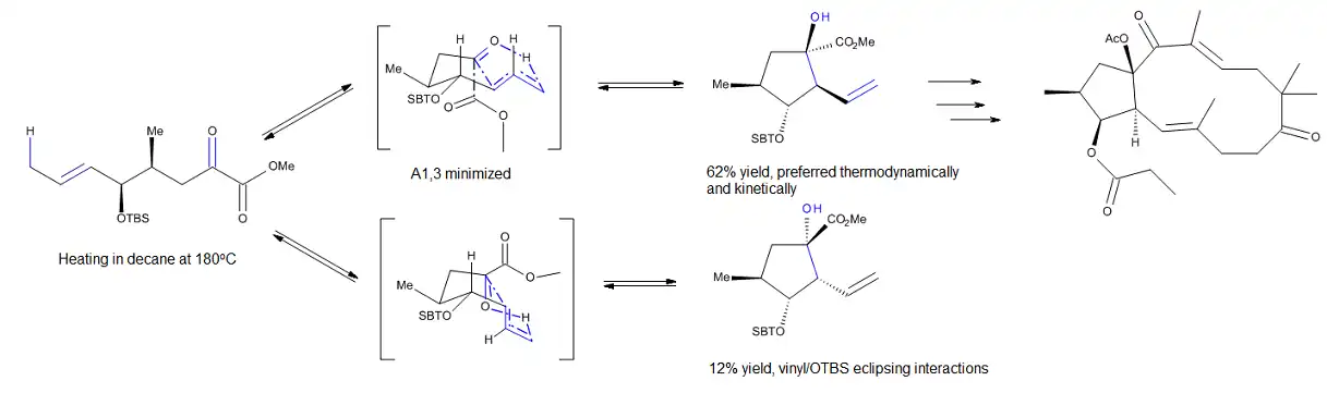 Schnabel e colaboradores[9] tem estudado uma reação carbonilo-eno intramolecular não catalisada, a qual foi usada para preparar o fragmento ciclopentano de jatrofa-5,12-dienos naturais e não naturais, membros da família de moduladores P-glicoproteína. Seus cálculos DFT, teoricamente, para a reação apresentada na Figura 3, propõe que a reação possa prosseguir através de um dos dois estados de transição concertados e do tipo envelope. O desenvolvimento de interações 1,3-transanulares no estado de transição desfavorecido fornece uma boa explicação para a seletividade deste processo.