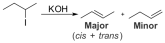 Por exemplo, quando o 2-iodobutano é tratado com hidróxido de potássio alcoólico (KOH), o 2-buteno é o principal produto e o 1-buteno é o menor.[1]