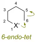 - em fechamentos de anel exo e endo, dependendo de se a ligação quebra-se durante o fechamento do anel está dentro (endo) ou fora (exo) do anel que se forma