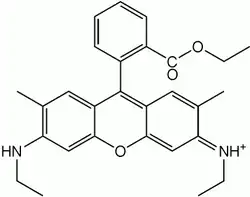 Estrutura SMILES: [Cl-].CCNc1cc2OC3=CC(=[NH+]CC)C(=CC3=C(c2cc1C)c4ccccc4C(=O)OCC)C