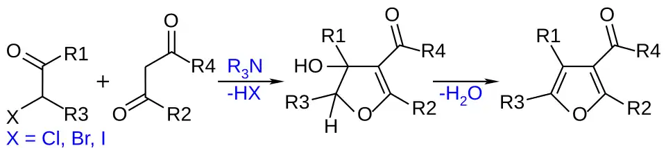 A síntese de Feist-Benary é uma reação orgânica entre α-halogeno cetonas e compostos β-dicarbonila a compostos de furano substituídos.[1][2] Esta reação de condensação é catalisada por aminas tais como amônia e piridina. A primeira etapa na síntese do anel é relacionada à condensação de Knoevenagel. Na segunda etapa o enolato substitui um halogeno alquila em uma Substituição nucleofílica aromática.