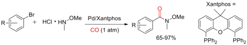 Finalmente, uma reação aminocarbonilação reportada por Stephen Buchwald permite a conversão de halogenetos de arilo diretamente a amidas de Weinreb aromáticas.[5]