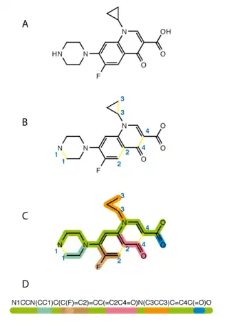 - ↑ Weininger, David (Agosto de 1990). «SMILES. 3. DEPICT. Graphical depiction of chemical structures». Journal of Chemical Information and Modeling. 30 (3): 237–43. doi:10.1021/ci00067a005