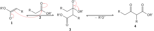 Os ésteres podem sofrer uma variedade de reações com nucleófilos de carbono. Tal como acontece com os halogenetos ácidos e os anidridos, eles reagem com um excesso de reagente de Grignard para dar álcoois terciários. Ésteres também reagem prontamente com enolatos. Na condensação de Claisen, um enolato de um éster (1) atacará o grupo carbonil de outro éster (2) para fornecer o intermediário tetraédrico 3. O intermediário entra em colapso, forçando um alcóxido (R'O-) e produzindo o β-ceto éster 4)
