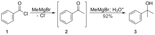 Os halogenetos ácidos reagem com nucleófilos de carbono, como reagentes de Grignard e enolatos, embora possam resultar misturas de produtos. Enquanto um nucleófilo de carbono reagirá primeiro com o halogeneto de ácido para produzir uma cetona, a cetona também é suscetível ao ataque nucleofílico e pode ser convertida em álcool terciário. Por exemplo, quando o cloreto de benzoílo (1) é tratado com dois equivalentes de um reagente de Grignard, como o brometo de metilmagnésio (MeMgBr), o 2-fenil-2-propanol (3) é obtido com excelente rendimento. Embora a acetofenona (2) seja um intermediário nessa reação, é impossível isolar-se porque reage rapidamente com um segundo equivalente de MeMgBr após a formação. [6]