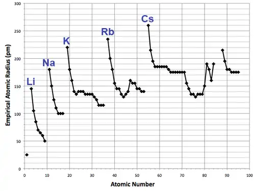 O raio atômico varia de um modo previsível e explicável através da tabela periódica. Por exemplo, o raio geralmente diminui ao longo de cada período da tabela, a partir dos metais alcalinos para os gases nobres; e aumenta dentro do grupo de cima para baixo. O raio aumenta significativamente entre o gás nobre no fim de cada período e o metal alcalino no período seguinte. Esta propriedade (e de várias outras propriedades físicas e químicas dos elementos) pode ser explicada pela teoria da configuração eletrônica do átomo; elas fornecem evidências importantes para o desenvolvimento e confirmação da teoria quântica.[50]