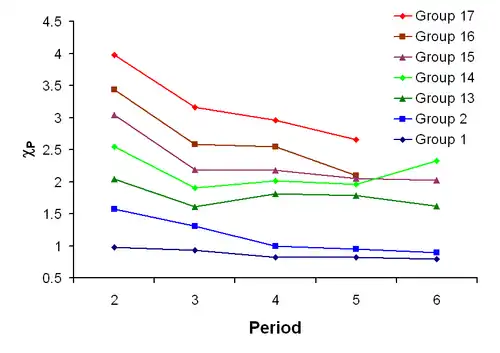 Existem algumas exceções para esta regra geral. O gálio e o germânio têm eletronegatividades superiores ao alumínio e silício, respectivamente, devido a contração do bloco d. Elementos do quarto período imediatamente após a primeira linha dos metais de transição têm um raio atômico surpreendentemente pequeno porque os elétrons 3d não são efetivos na blindagem do aumento da carga nuclear, e volumes atômicos menores implicam em uma eletronegatividade superior.[38] O chumbo tem uma eletronegatividade superior anômala, particularmente quando comparado com o tálio e o bismuto, que parece ser um artifício da seleção de dados e métodos de cálculo disponível ao invés do método de Pauling de mostrar a tendência periódica destes elementos.[55]