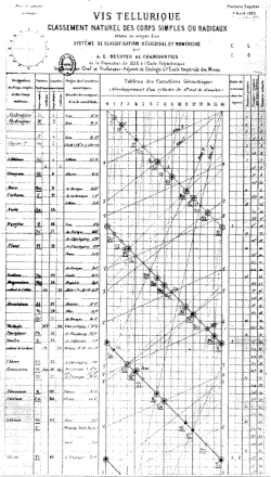 Em 1789, Antoine Lavoisier publicou uma lista de 33 elementos químicos. Embora Lavoisier tenha agrupado os elementos em substâncias simples, metálicas, não metálicas e salificáveis ou terrosas,[13][14] químicos passaram o século seguinte à procura de um esquema de construção mais precisa. Em 1829, Johann Wolfgang Döbereiner observou que muitos dos elementos poderiam ser agrupados em tríades (grupos de três) com base em suas propriedades químicas. Lítio, sódio e potássio, por exemplo, foram agrupados como sendo metais reativos frágeis. Döbereiner observou também que, quando organizados por peso atômico, o segundo membro de cada tríade tinha aproximadamente a média do primeiro e do terceiro.[15] Isso ficou conhecido como a lei das tríades.[16] O químico alemão Leopold Gmelin trabalhou com esse sistema e por volta de 1843 ele tinha identificado dez tríades, três grupos de quatro, e um grupo de cinco. Jean Baptiste Dumas publicou um trabalho em 1857 descrevendo as relações entre os diversos grupos de metais. Embora houvesse diversos químicos capazes de identificar relações entre pequenos grupos de elementos, não havia ainda um esquema capaz de abranger todos eles.[13][15]