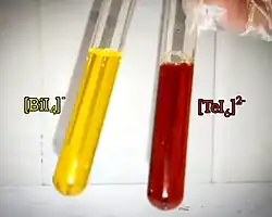 .[43] Diferente da maioria dos metais, que se dissolvem no ácido para gerar cátions simples, ou dos não-metais que geralmente não reagem, o telúrio reage formando esse cátion poliatômico Te2+