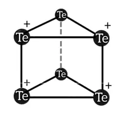 , formado por dois anéis pentagonais de átomos de telúrio unidos por uma aresta. Esse cátion se forma pela reação do telúrio elementar com o hexacloreto de tungstênio.[44]