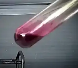 Telúrio dissolvido em ácido sulfúrico concentrado. A solução de cor vermelho-púrpura contém o cátion poliatômico Te42+.