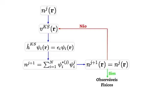 É necessário resolver a equação de KS para determinar a densidade eletrônica, entretanto, depende de e não é possível resolver a equação diretamente. Nesse caso, comumente, é adotado um cálculo autoconsistente.