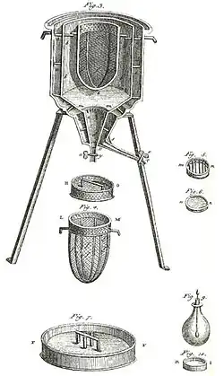 Primeiro calorímetro de gelo do mundo, usado no inverno de 1782–83 por Antoine Lavoisier e Pierre-Simon Laplace, para determinar o calor envolvido em várias alteração química, que eram baseados na descoberta anterior de Joseph Black do calor latente. Esse experimentos marcam a fundação da termoquímica